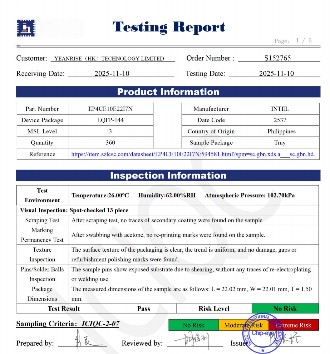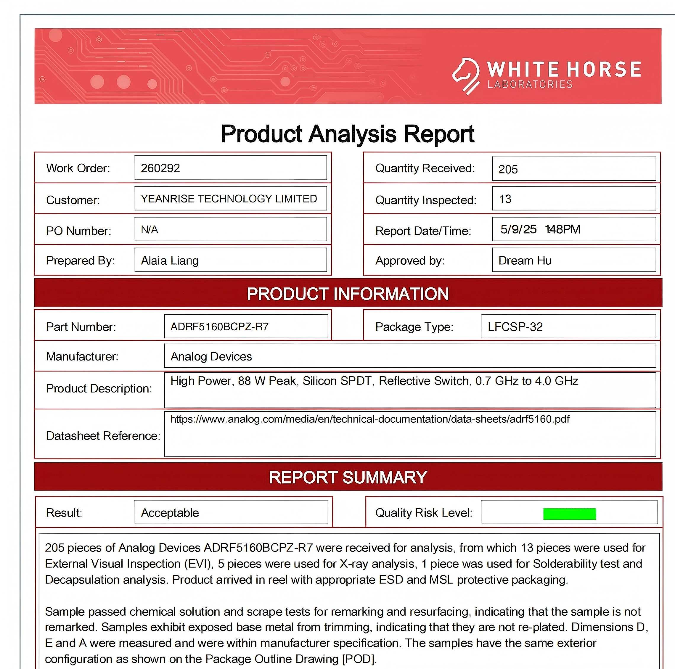 我们所有的组件都是 100% 新的和原装的。YeanRise 在发货前通过经过认证的第三方机构进行严格测试,并可以提供详细的测试报告。此外,如果需要,我们支持运送到 White Horse 进行进一步测试。